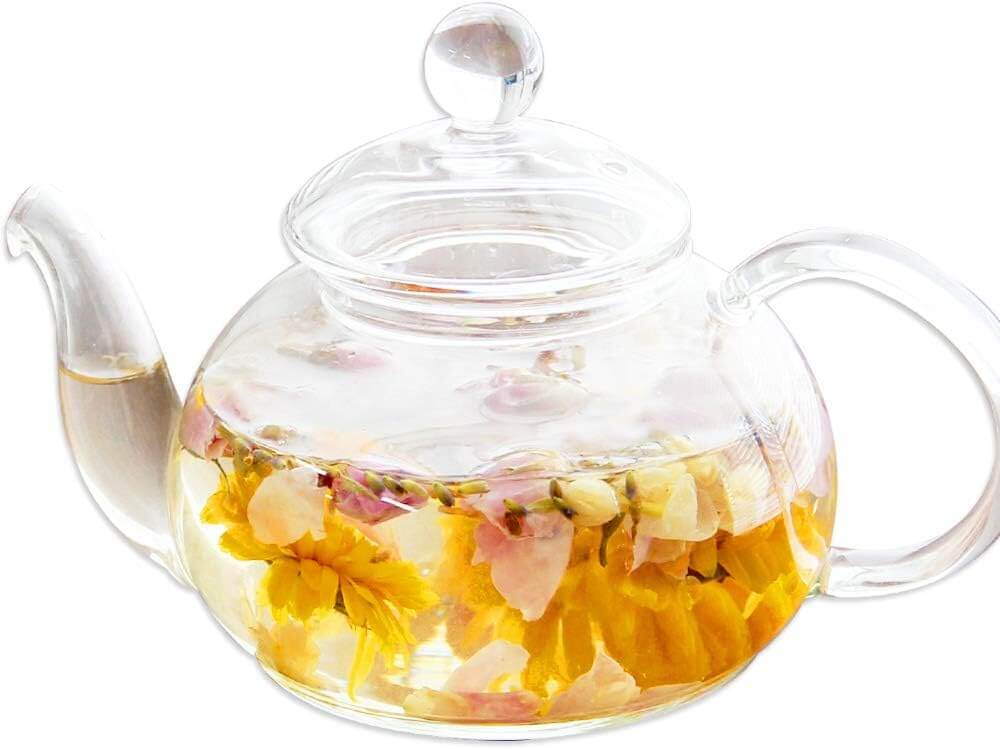 丈夫で軽い耐熱ガラス製のティーポットは、ホットにもアイスにも対応できる万能タイプ。透明なボディ越しにお茶が抽出されていく様子を眺めながら、ゆったりとした時間を過ごせます。注ぎ口はお湯が跳ねにくい角度設計で、機能性も抜群。針金茶こしは注ぎ口付近のみに取り付けるタイプで、ポット内全体を使って茶葉がのびやかにジャンピングします。ローズやコーンフラワー(矢車菊)などのドライハーブを入れれば、花びらが湯の中でふわりと舞う美しい光景も楽しめる、心を和ませる一品です。