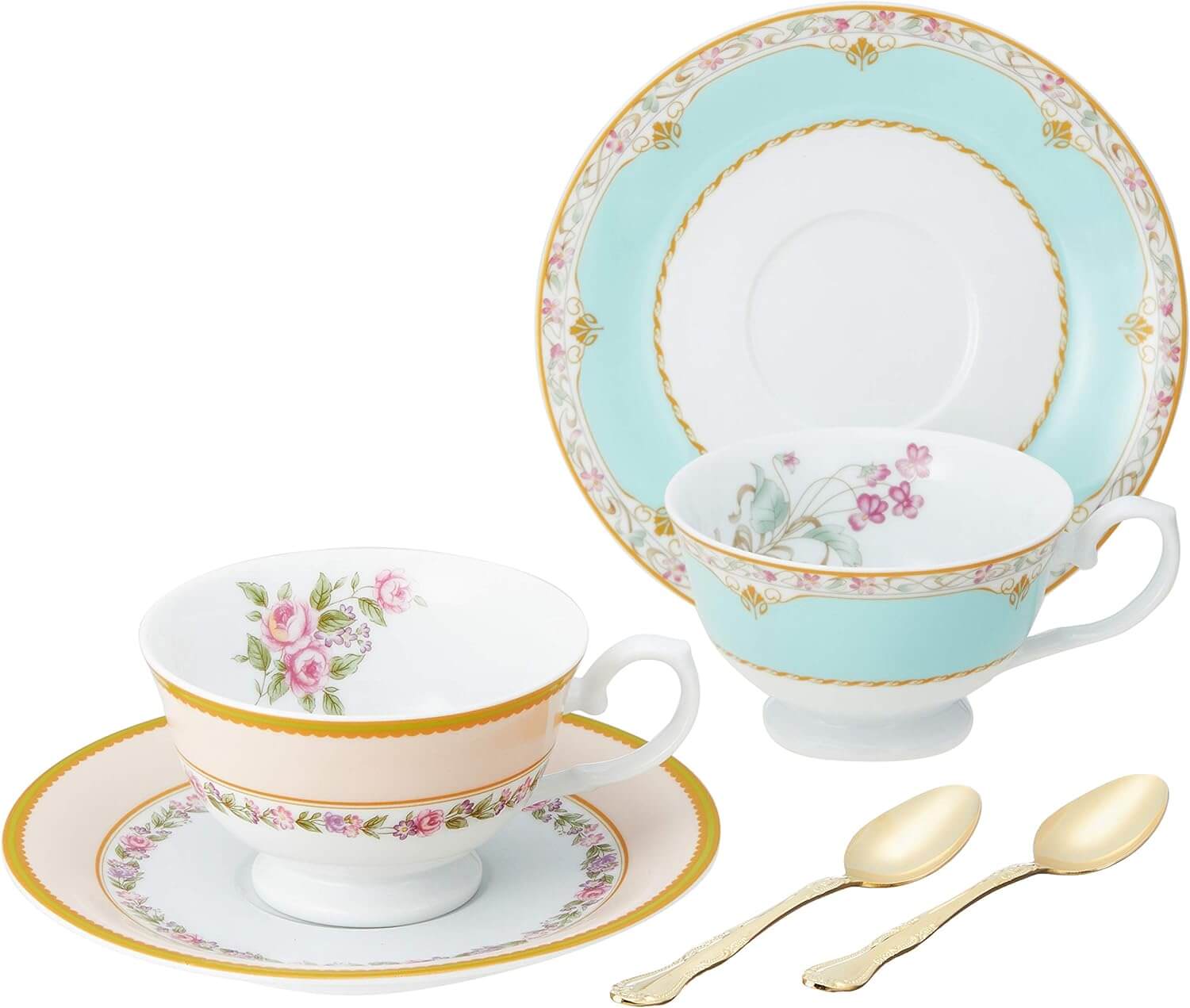 やわらかな花柄とパステルカラーに金のラインが映える、上品なペアカップ&ソーサー。カップの内側まで絵柄が施され、まるでヨーロッパのカフェにいるような優雅なひとときを楽しめます。華やかさと落ち着きを兼ね備えたデザインは、来客用にも自分へのご褒美にもぴったり。電子レンジでも使用できる金彩を採用しており、美しさと使いやすさの両方を実現しています。どなたにも好まれる定番から個性的なものまで、豊富なラインナップが揃っているのも魅力です。