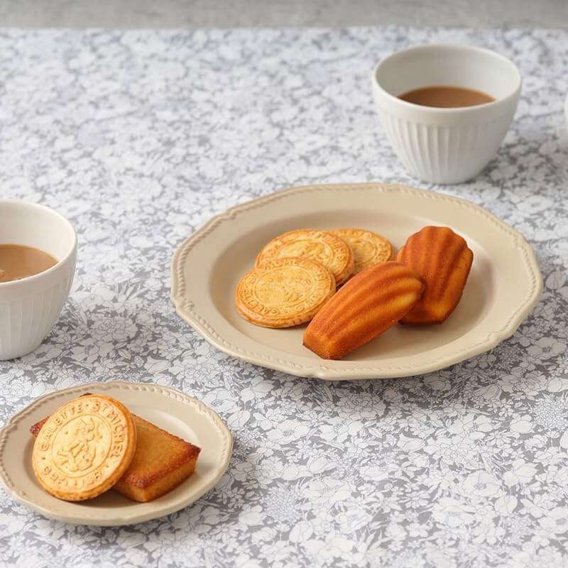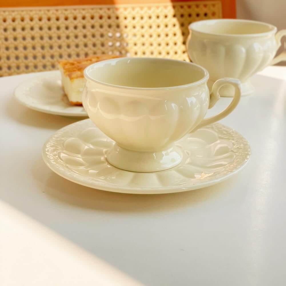 花びらモチーフのような曲線と、レース調の縁取りがかわいいティーカップ&ソーサー。やさしいアイボリーカラーと、ころんとしたフォルムが大人かわいい雰囲気を引き立てます。ソーサーは単体でスイーツプレートとしても使えるので、シーンに合わせてアレンジできるのも魅力。ティーカップのみ、ソーサーのみ、カップ&ソーサー、さらにスプーン付きの4パターンから選べるのも嬉しいポイントです。毎日のカフェタイムを、上品で心地よいひとときにしてくれます。