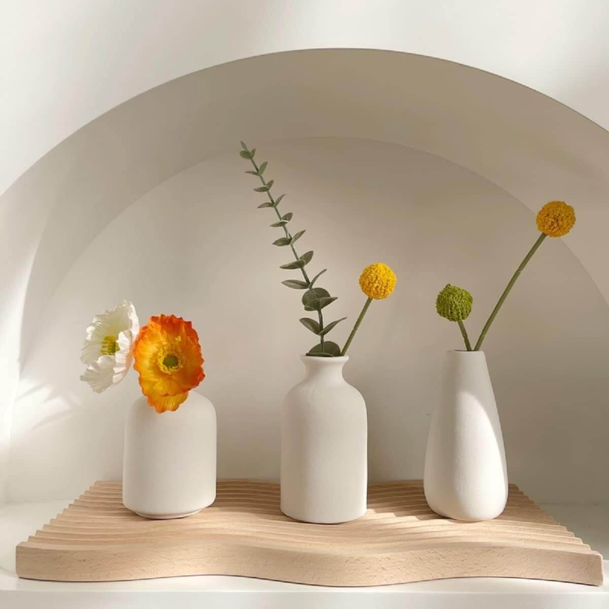 マットなホワイトカラーの小さめフラワーベース3点セット。リビングや寝室、玄関などどんな空間にもすっとなじみます。一輪挿しにぴったりで、生花や造花、ドライフラワーをさりげなく飾るだけで上品な雰囲気に。3つ並べても、気に入った1つだけテーブルコーディネートに取り入れてもOK。韓国カフェのようなナチュラルで落ち着いた空間作りにおすすめのアイテムです。