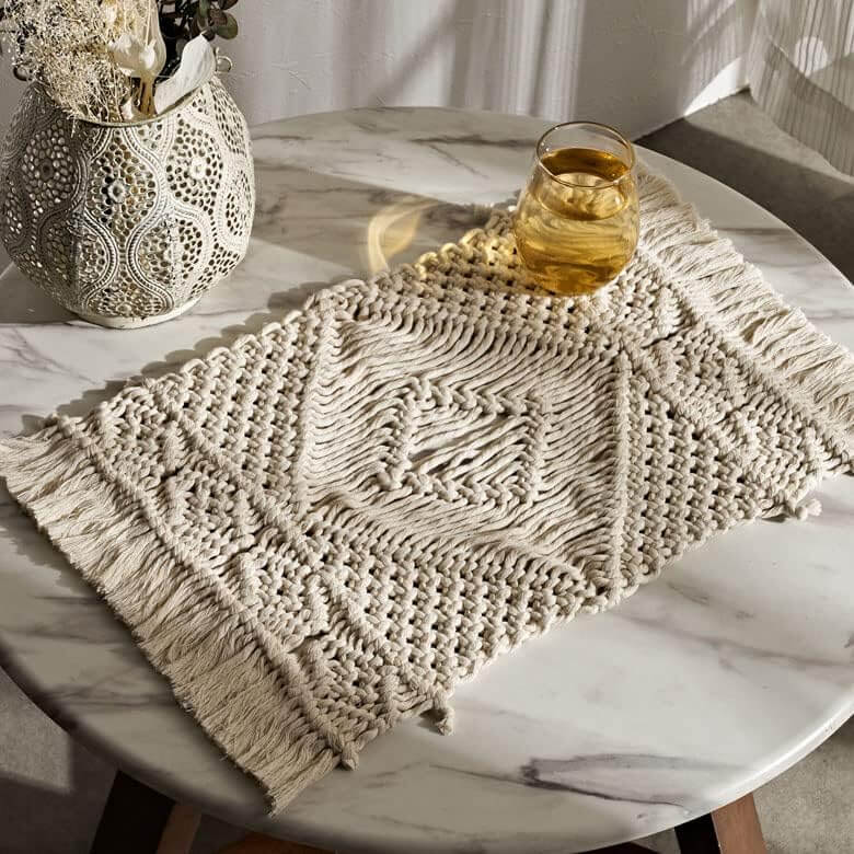 インドの職人による手編みマクラメのプレースマット。独特の編み目とフリンジがテーブルに温かみをプラスしてくれます。ティータイムのランチョンマットはもちろん、フラワーベースや小物を置くプレイスマットとしても活躍。ハンドメイドならではの個性ある表情が、韓国風や北欧風のインテリアにも自然に馴染みます。日常のちょっとしたシーンに、柔らかな手仕事のぬくもりを添えてくれるアイテムです。