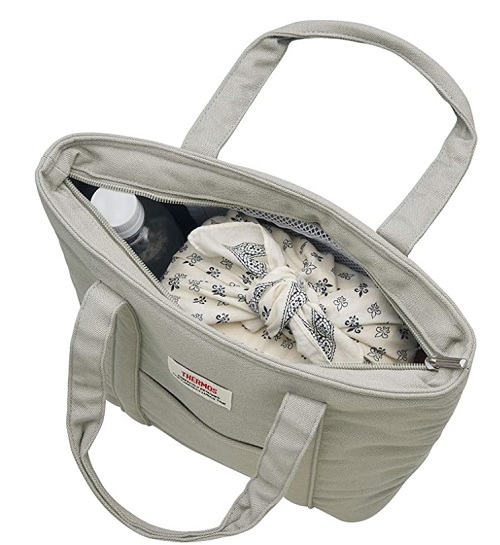シンプルなカラー展開の保冷バッグ。ダブルファスナーという点も使いやすいので嬉しいですね。がま口タイプなため、出し入れもスムーズでありながらも、しっかりとジッパーで保温をします。中にはお弁当だけではなく、ペットボトルも入るようなゴムバンドも付属しているので暑い季節にぜひ使いたいですね。
