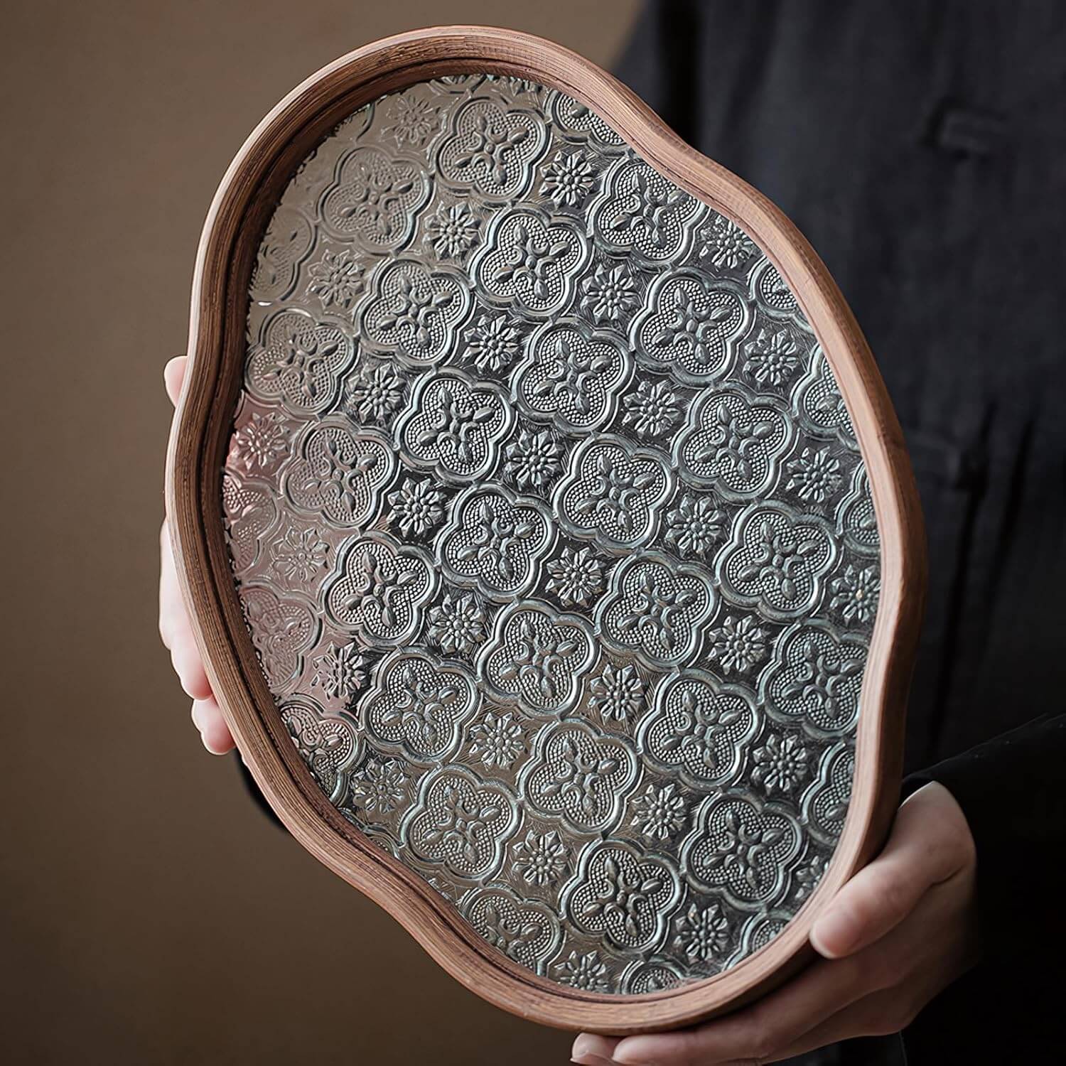 昭和を感じさせるレトロなデザインが魅力のガラストレー。耐熱ガラス製なので、熱い茶器やポットを直接置いても安心です。ランチョンマット代わりや食器の持ち運びに便利で、さっと拭くだけでお手入れでき、食洗機にも対応。裏面の海棠柄が光を透かして美しい表情を見せ、アクセサリーや小物を並べても上品に映えます。おうちのカフェ空間をぐっと格上げしてくれる一枚です。