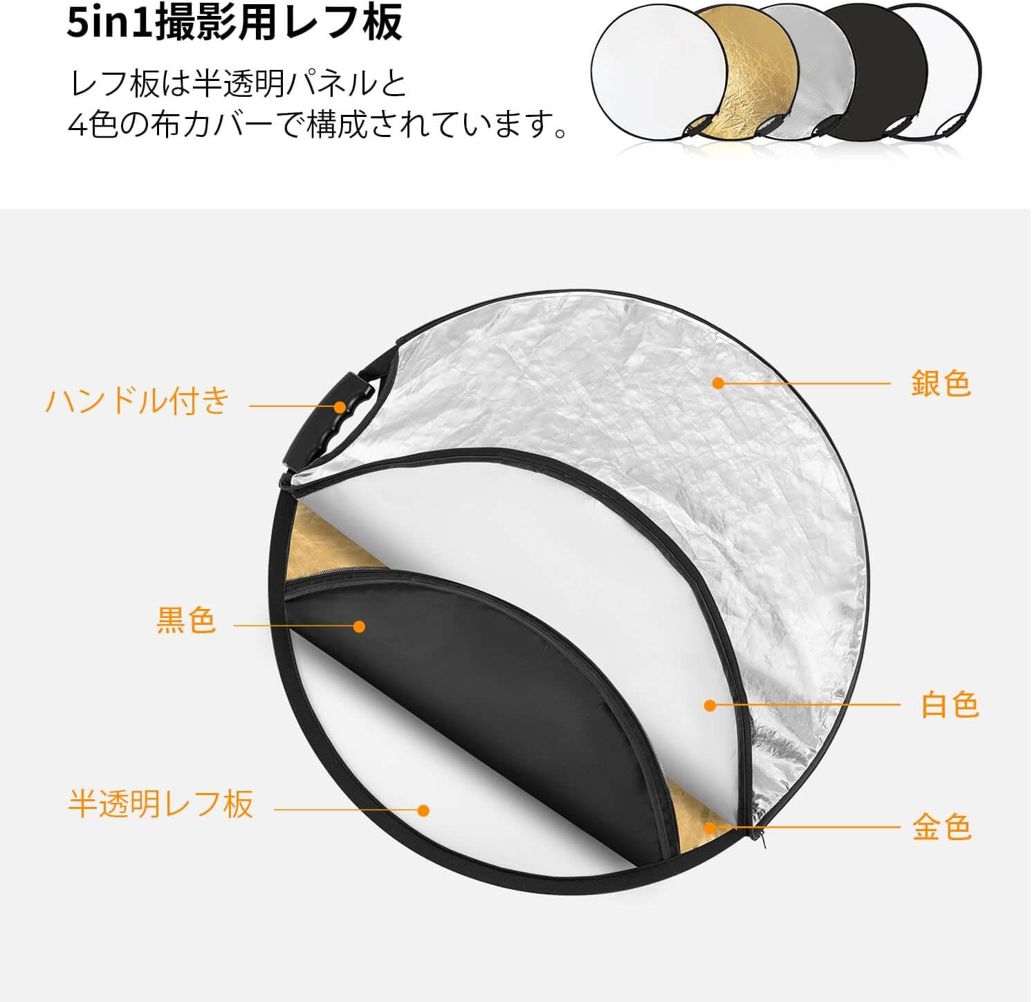 K&F CONCEPT レフ板 撮影用 反射板 持ち手付き ハンドル付き 60cm 折り畳み式 5in1 撮影用リフレクター 丸レフ板 屋外照明 白 黒 銀 金 半透明 収納ポーチ付き