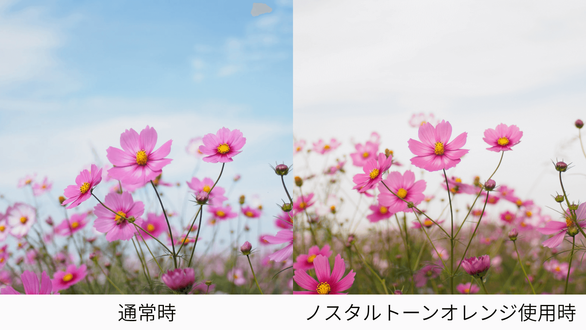 ノスタルトーン・オレンジは、人気フォトグラファー「Akine Coco」氏監修のソフトフィルターで、写真をまるでアニメのワンシーンのようにノスタルジックに表現できます。日常の風景も温かみや懐かしさを帯び、夕暮れの光や紅葉などの暖色系シーンでは色彩をさらに際立たせます。弱めのソフト効果やゴースト、リング効果により、太陽光を取り込むと幻想的なフレアが生まれ、ドラマティックな雰囲気を演出。光の出方は角度や焦点距離で変わるため、カメラの設定を調整しながら好みの描写を追求できます。