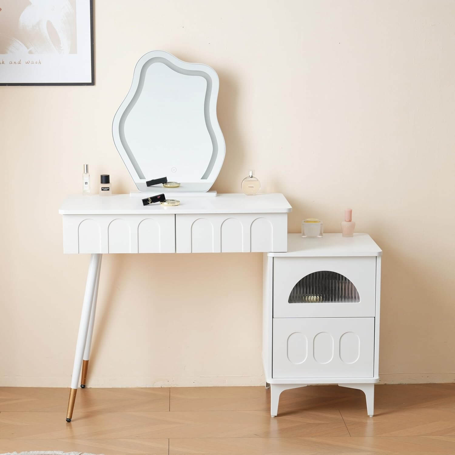 優美な曲線ミラーとフロントの彫り模様が上品さと可愛らしさを添えてくれる、韓国風インテリアにぴったりなドレッサーです。広々とした天板にはお気に入りのコスメやアクセサリーをゆったり置け、忙しい朝もスムーズに準備ができます。引き出し付きで収納力も抜群、サイドキャビネットは左右入れ替え可能でレイアウト自由。LEDライトは無段階調節と3色モード対応で、天候や時間帯に左右されず理想の明かりを演出。美しい木目模様でお手入れも簡単、毎日の身支度がまるで韓国ドラマのヒロインになった気分になる、特別な空間づくりに役立つ一台です。