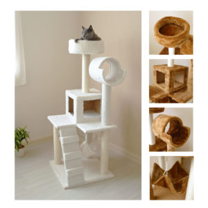 猫が遊ぶための工夫がされており、ゆっくりできる場所もあれば、トンネルや穴、お家などキャットタワー1つで様々な遊び方ができます。台座が多い分、爪とぎポールも多く使われているので色んな場所で爪とぎを行うことができます。